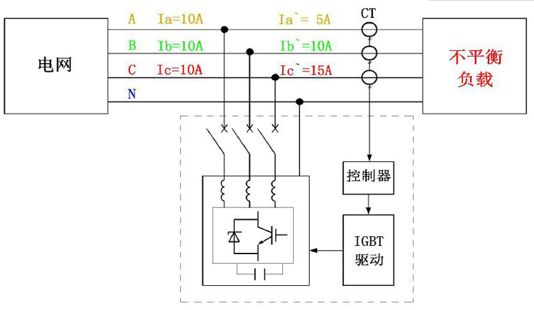 SPC通过电流互感器实时监测负载侧电流,通过内部DSP处理分析,计算达到平衡状态各相需要的补偿电流,然后驱动IGBT输出,实现三相电流平衡。